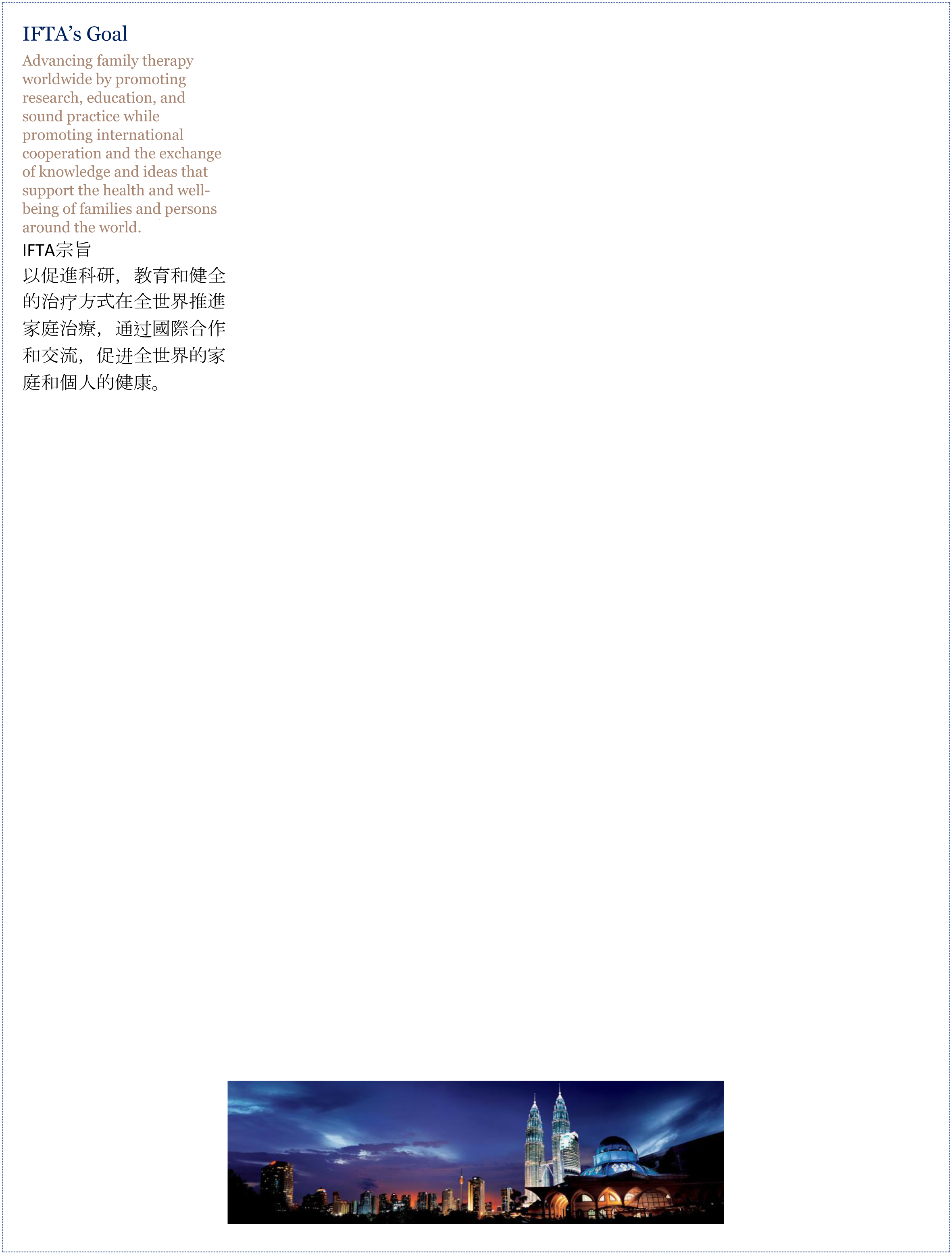 IFTA, working in a collaborative spirit with other professionals and organizations around the world who share its mission, also promotes continuing education in the development of quality standards for marriage and family therapy for professionals performing family therapy in order that they may better assist families in the communities in which they serve.